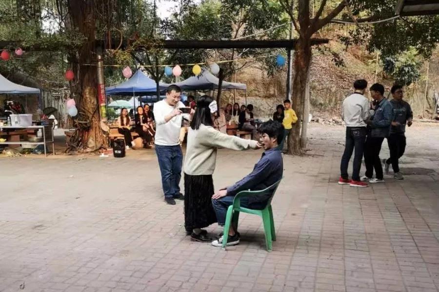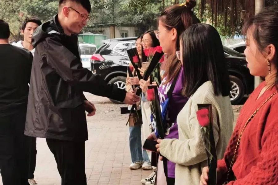 隨后,大家又開始了第二輪游戲——“蒙面速遞”。男女搭檔相隔五米,女搭檔拿著餅干,蒙上眼睛蒙原地轉(zhuǎn)圈三秒,男搭檔坐在椅子上,指揮女搭檔將餅干喂給自己,游戲優(yōu)勝者可以給女搭檔送禮物。游戲結(jié)束之后,所有男生向每一位女生送上美麗的鮮花。