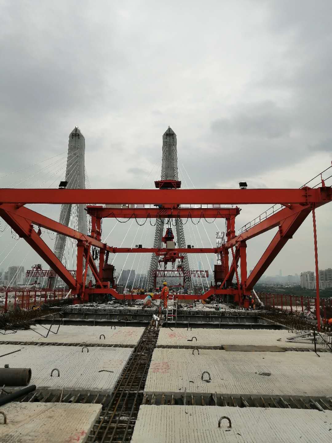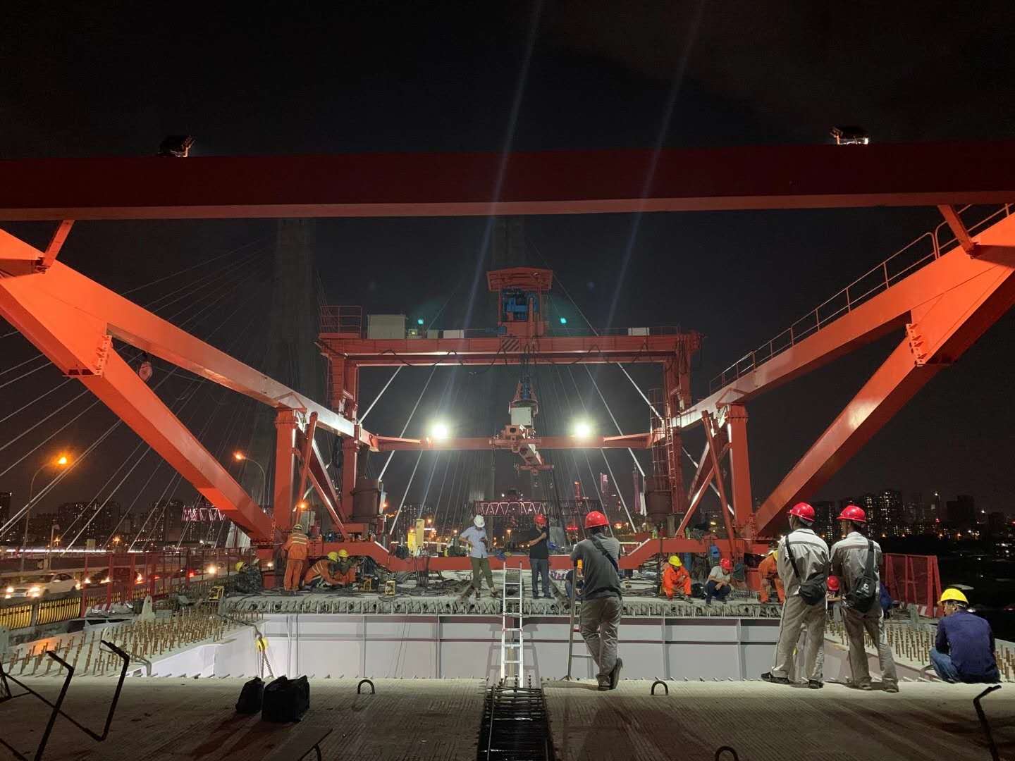 至6月份定位段安裝完成后,為了完成總體計(jì)劃目標(biāo),業(yè)主方提出按照每個(gè)節(jié)段施工6天的標(biāo)準(zhǔn)周期編制計(jì)劃,主橋按照8臺(tái)橋面吊機(jī)、4臺(tái)履帶吊共12個(gè)作業(yè)點(diǎn)同步作業(yè),這對(duì)于項(xiàng)目組來(lái)說(shuō)是巨大的挑戰(zhàn)。再加上施工現(xiàn)場(chǎng)無(wú)堆場(chǎng),只能當(dāng)天到貨安排卸車(chē)吊裝,這無(wú)疑又增加了難度。為了按照周期完成節(jié)點(diǎn)任務(wù),項(xiàng)目組與施工班組進(jìn)一步分解生產(chǎn)計(jì)劃,落實(shí)各作業(yè)點(diǎn)施工人員,跟進(jìn)現(xiàn)場(chǎng)工作調(diào)配,運(yùn)輸、卸車(chē)吊裝、裝配、焊接、焊縫無(wú)損檢測(cè)、補(bǔ)涂都按照小時(shí)計(jì)劃編制,確保了各個(gè)吊裝工位的吊裝分段節(jié)點(diǎn)按期完成,為下一道混凝土澆筑、斜拉索安裝工序爭(zhēng)取施工時(shí)間。
