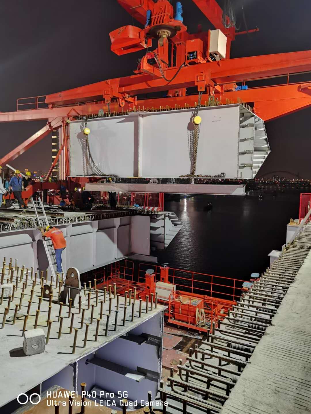 該項(xiàng)目在春節(jié)后受疫情影響,橋梁主塔基建施工單位進(jìn)度滯后,原計(jì)劃的現(xiàn)場(chǎng)吊裝節(jié)點(diǎn)延后2個(gè)月,導(dǎo)致現(xiàn)場(chǎng)吊裝周期壓縮。為了保障年底通車(chē)目標(biāo),項(xiàng)目組調(diào)整吊裝技術(shù)方案,將原來(lái)的橋塔定位段小節(jié)段吊裝調(diào)整為總段吊裝,把鋼箱梁、風(fēng)嘴、中橫梁、小縱梁結(jié)構(gòu)在廠內(nèi)總拼后再運(yùn)往現(xiàn)場(chǎng)安裝。通過(guò)對(duì)制作場(chǎng)地、技術(shù)方案、吊機(jī)設(shè)備提前策劃,施工班組克服外場(chǎng)施工難度大、雨水天氣較多等不良因素影響,加班加點(diǎn)完成任務(wù),并順利通過(guò)驗(yàn)收及時(shí)發(fā)貨,確保5月1日順利吊裝。
