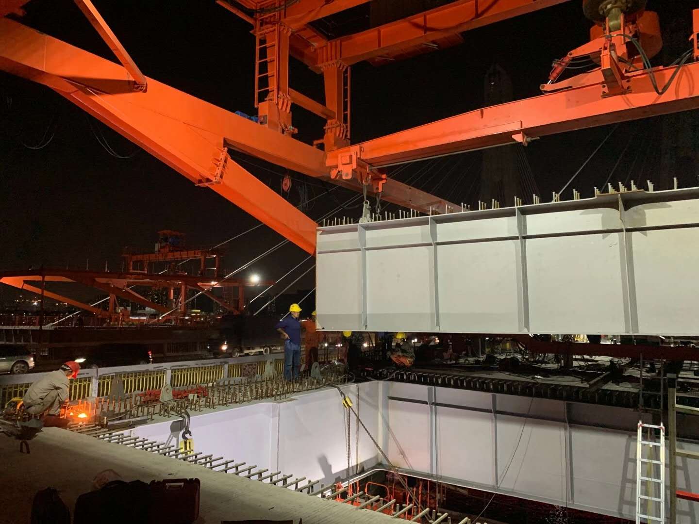 10月12日,隨著洛溪大橋拓寬工程主橋安裝現(xiàn)場(chǎng)的鞭炮聲響起,主橋左幅的橋面吊機(jī)把最后一個(gè)鋼箱梁合攏分段起吊,經(jīng)過(guò)48小時(shí)連續(xù)作業(yè),合攏段結(jié)構(gòu)焊縫全部驗(yàn)收完工,交付給下一道工序,為完成洛溪大橋年底通車(chē)目標(biāo)奠定了堅(jiān)實(shí)的基礎(chǔ)。