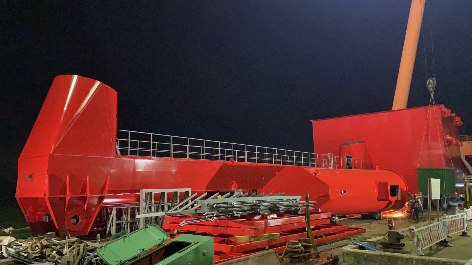 12月14日晚,公司圓滿完成了文沖修造400噸門式起重機(jī)項(xiàng)目的柔性腿上接頭、下橫梁、端梁1分段裝船海綁工作,標(biāo)志著該項(xiàng)目廠內(nèi)制作工作已按照計(jì)劃順利完工。公司此次建造的400噸門機(jī)整機(jī)重量約2818.5噸,額定起重量為400噸,跨距為150米,吊排吊點(diǎn)起升高度可達(dá)軌面以上80米,是公司繼100噸門座式起重機(jī)交付后,與廣船國際再度展開的合作。
